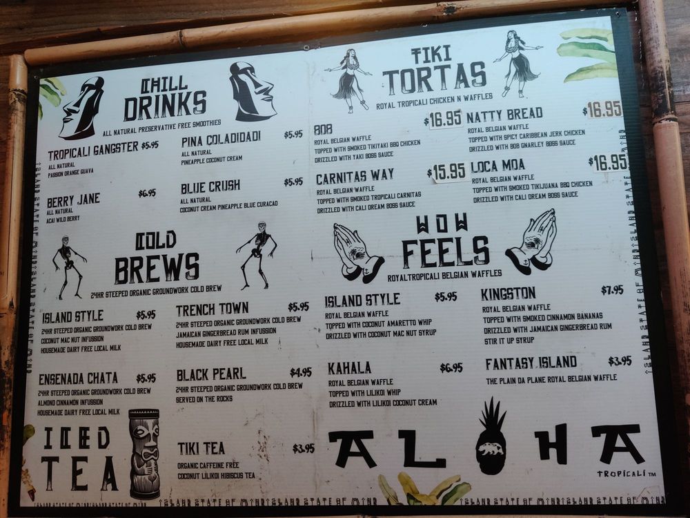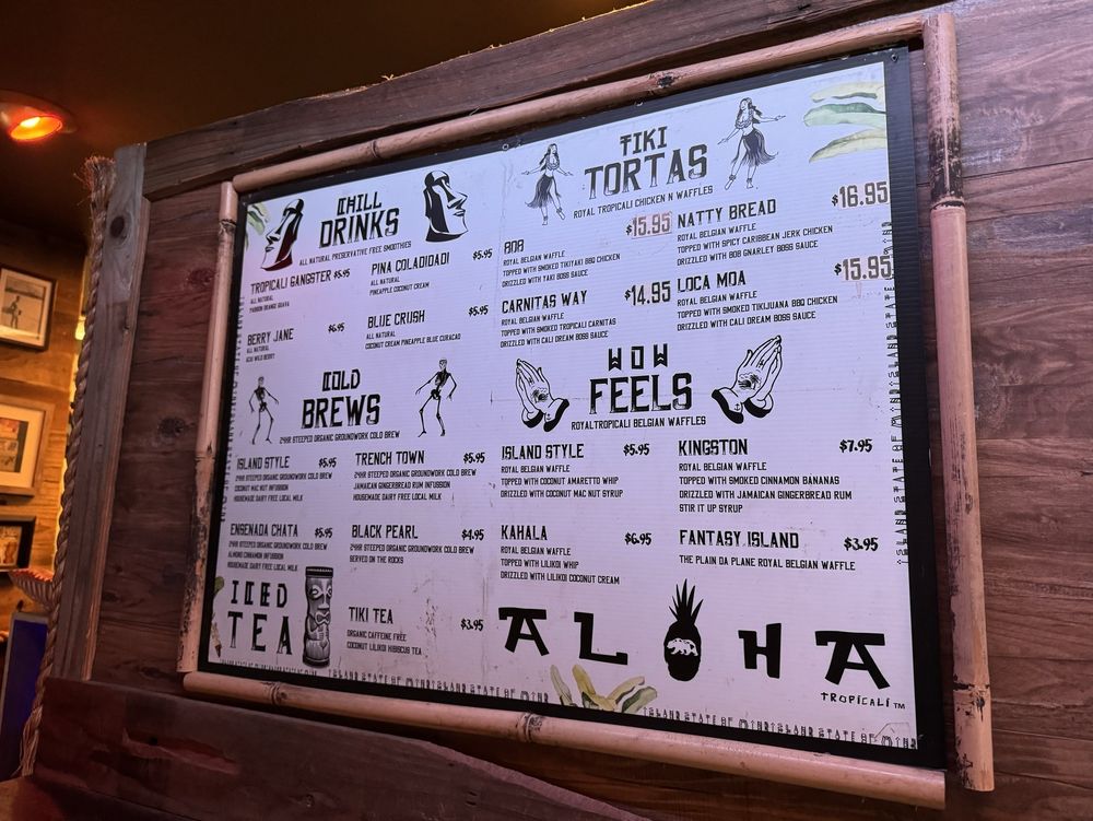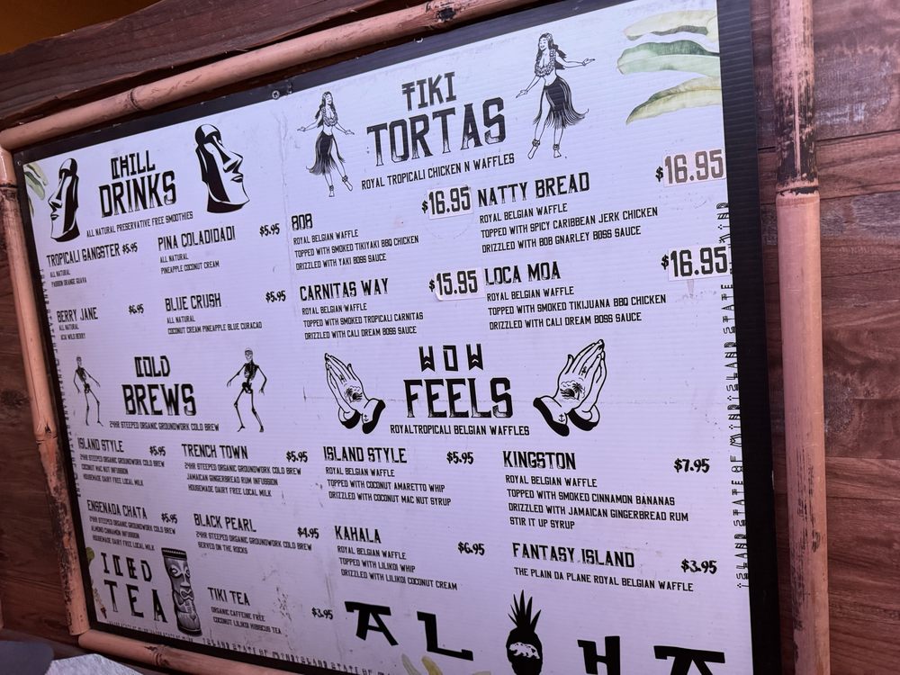 Royal belgian waffle topped with smoked tikijuana bbq chicken drizzled with cali dream boss sauce